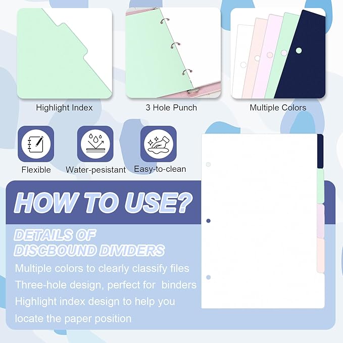 - 2. Product Details - Our Index Dividers are very practical. There are 5 dividers for 3 ring binders in a set, available in five colors - pink, blue, purple, green, white. And the side labels allow you to label them with any writing instrument. So you can easily categorize your folders, keeping your documents organized and easy to find. You can choose the quantity according to your needs.