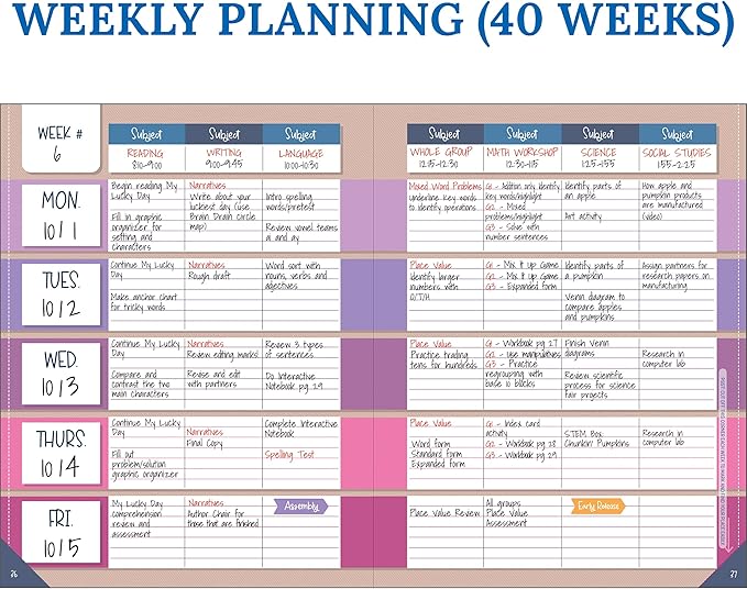 - Classroom Management Teacher Supplies: Use the comprehensive information section of the weekly planner to record substitute information, log communication, store contact information, create year-long plans and goals, and more.