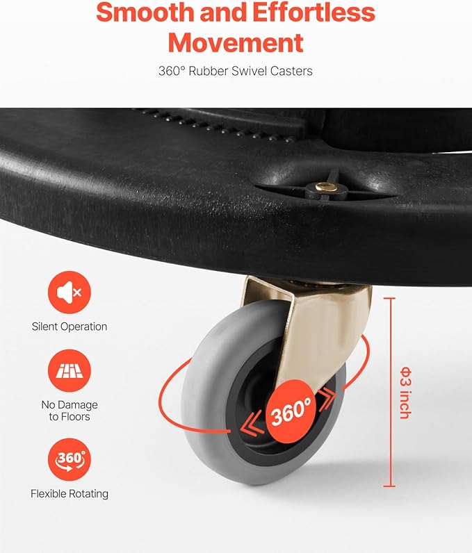- Smooth and Quiet Movement: Equipped with 5 x 3-inch swivel casters, this trash can roller base moves easily and smoothly, even on various surfaces. Its quiet design reduces noise, while the casters’ special surface treatment protects floors from scratches, providing a comfortable and efficient transport experience.