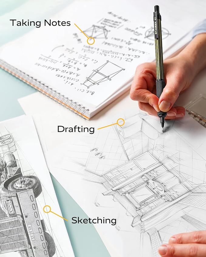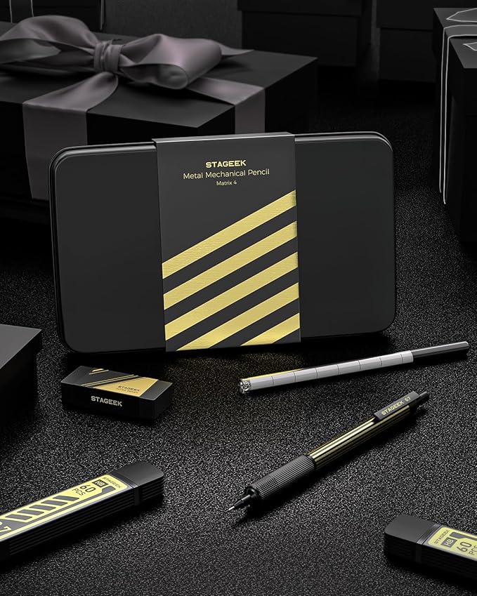 - [Unique design] STAGEEK mechanical pencil features a full metal body with luxurious gold stripes, allowing you to express your unique style wherever you write. The metal mechanical pencil grip features a threaded anti-slip design, designed not to break or crack from drops, antirust, sweat and waterproof