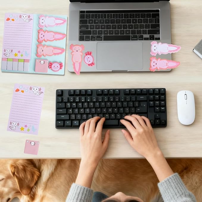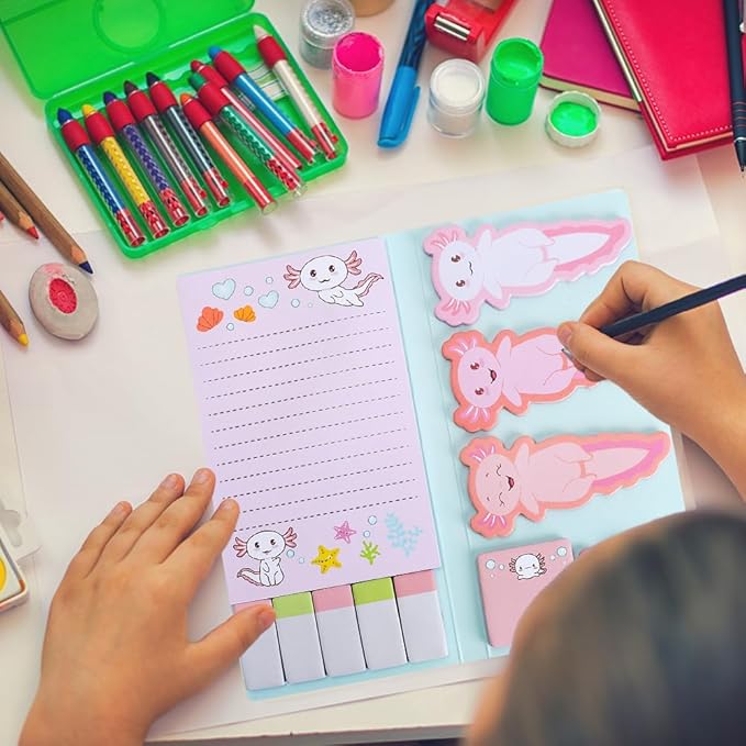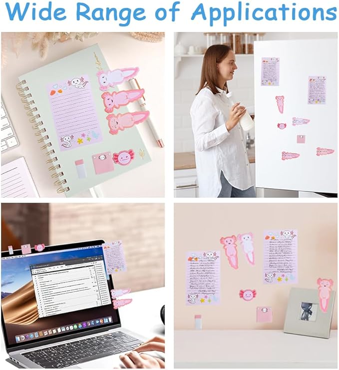 - High Quality】The paper used in this Axolotl sticky note set is soft and smooth to write on,with strong adhesive properties that won't leave residue when peeled off.Perfect for daily reminders,reading notes,bookmarking pages,or journal entries,these notes stick securely to office documents,computers,desks,doors,windows,walls,and refrigerators—capturing inspiration anytime,anywhere.