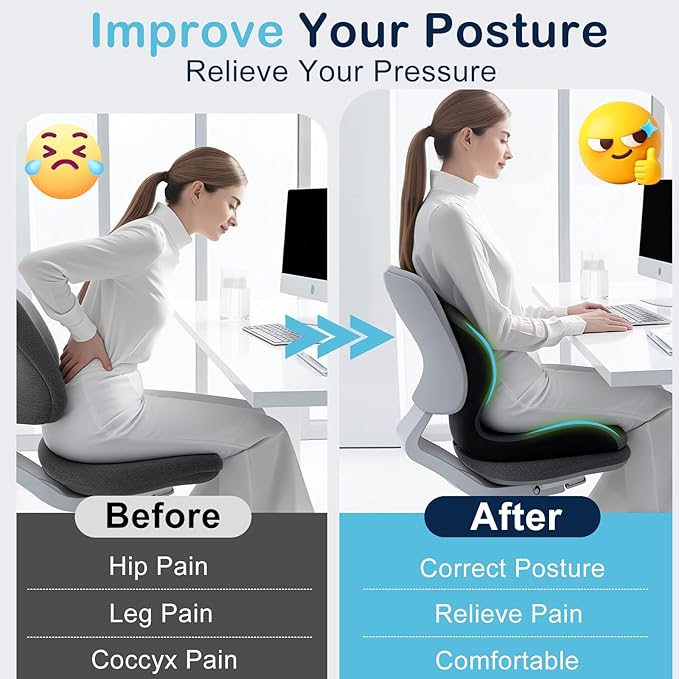 - 【Non-Slip & Breathable Build】The bottom of the seat cushion is covered with non-slip gripper dots to keep it securely in place—no more constant adjusting. Its open-tailbone design allows air to circulate freely, preventing heat and moisture buildup. This makes it the ideal comfortable lumbar support pillow for office chair for long work sessions, staying put on office chairs, car seats, gaming chairs, recliners, desk chairs, wheelchairs, and more.